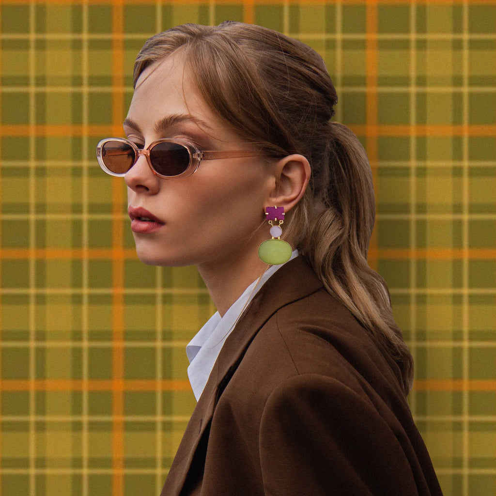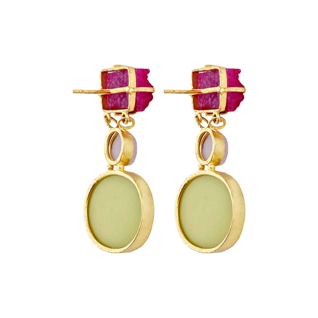 Gold Plated Earrings w/ Durzy & Chalcedony Stones & Green Resin