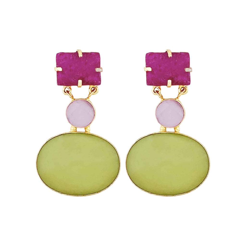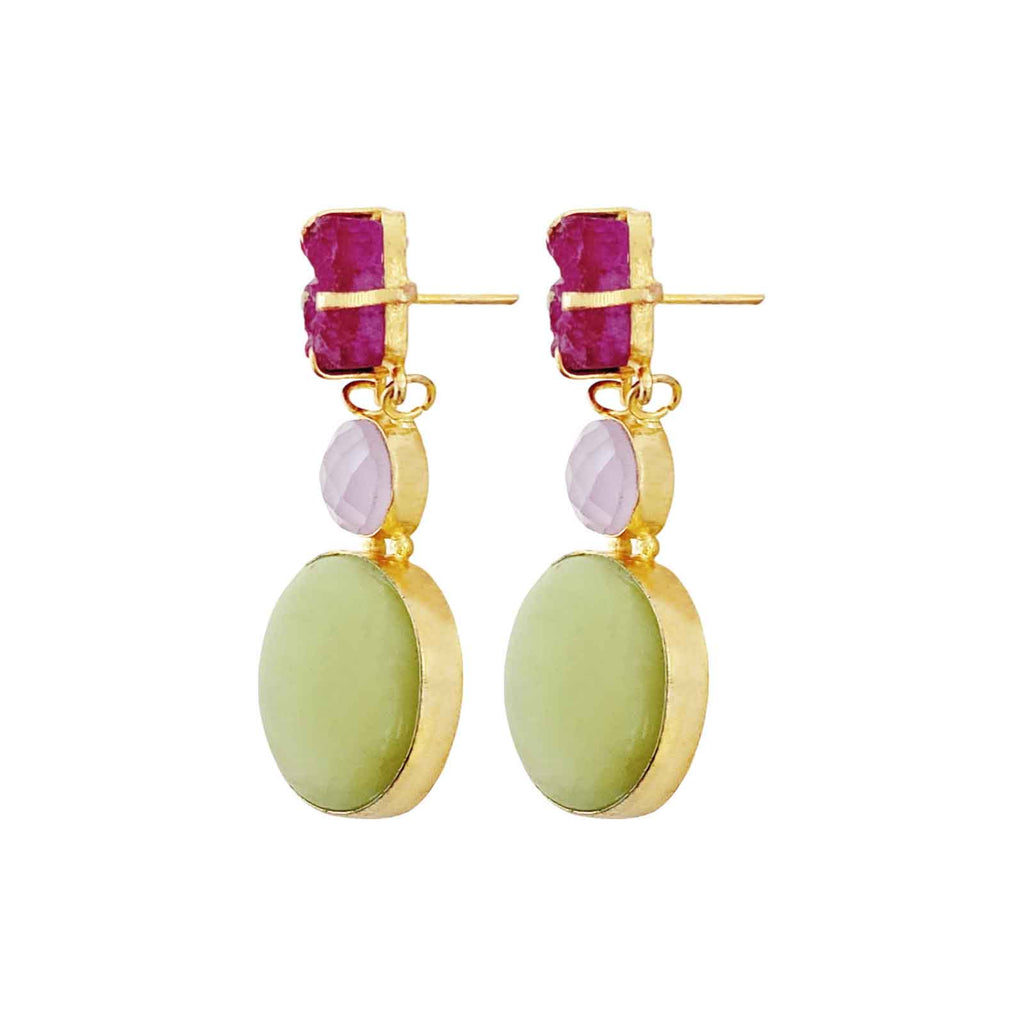 Brincos c/ Banho de Ouro c/ Quartzo Rosa & Calcedônia Verde Clara & Pedras Brancas de Arco-íris